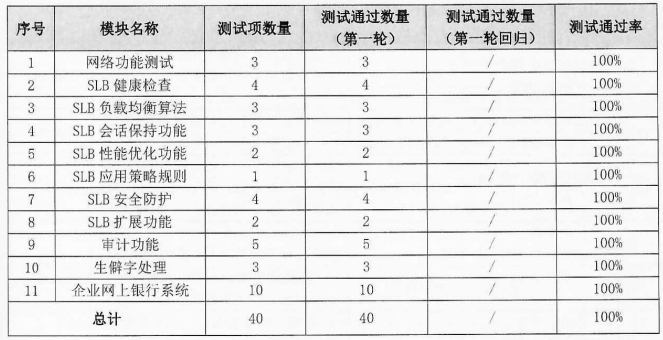 功能性方面:測試范圍包括網(wǎng)絡(luò)功能測試、SLB健康檢查、SLB負(fù)載均衡算法、SLB會(huì)話保持功能、SLB安全防護(hù)、SLB擴(kuò)展測試等11個(gè)模塊,共計(jì)執(zhí)行40條用例,均通過測試。