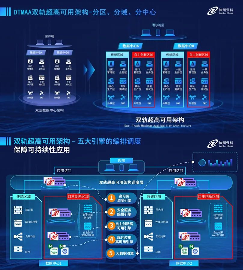 為助力銀行業(yè)務高質(zhì)量發(fā)展,更好地應對數(shù)字經(jīng)濟時代對可持續(xù)性的高要求,實現(xiàn)“信創(chuàng)”與“數(shù)字化”齊頭并進,leyu.樂魚創(chuàng)新性的推出了雙軌超高可用架構(gòu)。該架構(gòu)在雙活數(shù)據(jù)中心的分區(qū)調(diào)度基礎上,增加信創(chuàng)域和非信創(chuàng)域的分域調(diào)度,實行信創(chuàng)域與傳統(tǒng)域應用全量部署,使雙中心運營變?yōu)殡p中心四區(qū)域并行運行,互為多活,將“0到1”的單軌建設道路變?yōu)榉謪^(qū)分域協(xié)同的多活雙軌超高可用架構(gòu)。幫助客戶在新架構(gòu)下,保障“信創(chuàng)”的同時解決性能瓶頸,提升穩(wěn)定性,保證應用可持續(xù)性,最終實現(xiàn)信創(chuàng)區(qū)域和非信創(chuàng)區(qū)域的平滑過渡,完成國產(chǎn)化替代目標。